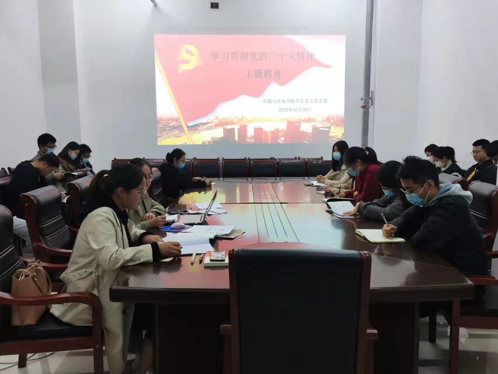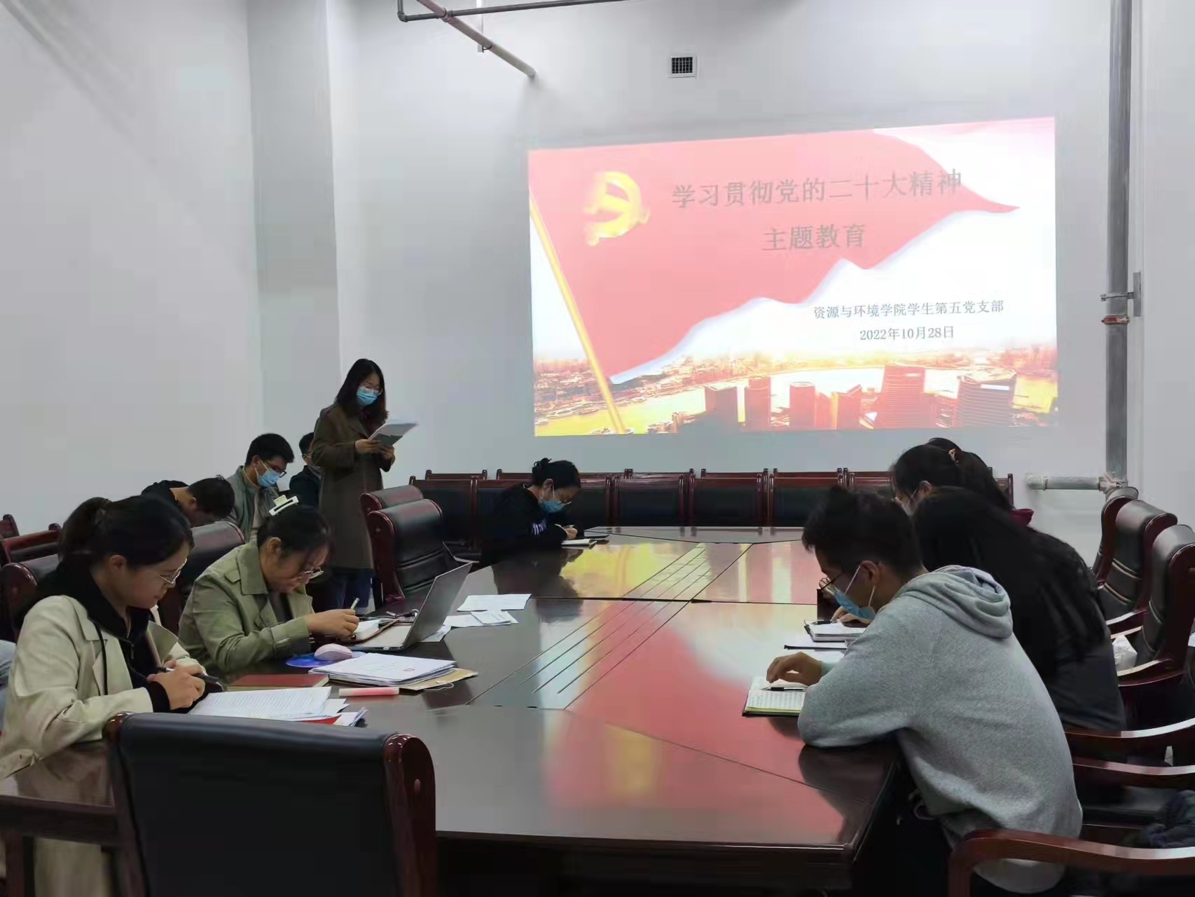 会上,学生第五党支部书记黄春萌领学了《习近平在中国共产党第二十次全国代表大会上的报告》、《中国共产党第二十次全国代表大会关于〈中国共产党章程(修正案)〉的决议》、《中国共产党第二十次全国代表大会关于十九届中央委员会报告的决议》。支部成员围绕学习贯彻党的二十大精神进行交流发言,纷纷表示今后会认真学习、深刻领悟党的二十大精神内涵,以勤学积淀力量、以奋斗成就事业、以奉献彰显风采。