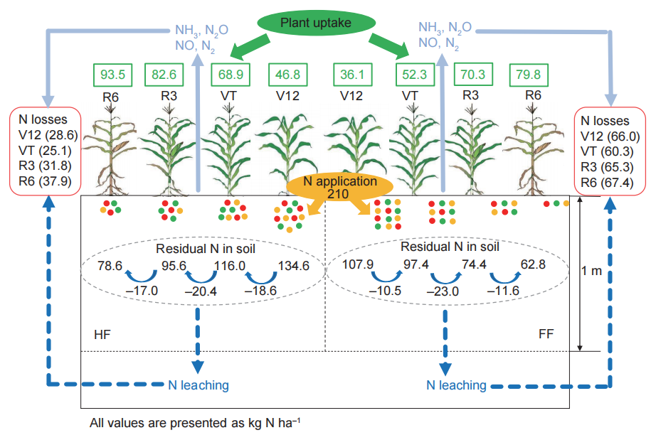 根区一次性施肥是提高夏玉米氮肥利用效率的有效策略,普通尿素与控释尿素一次性配施是降低氮损失与提高作物产量之间协同的有效途径,但其配施后氮的分布规律尚不清楚。基于此,采用田间结合微区试验,以15N标记的控释尿素5:5混合普通尿素为供试肥料,研究了开沟条施(农民施肥习惯)和根区穴施两种施肥模式效应。根区穴施三年平均产量和氮肥利用率较条施分别提高了8.5%和22.3%,增加了土壤耕层中矿质氮积累,可为后季氮素可持续利用库存。研究成果以“Hole fertilization in the root zone facilitates maize yield and nitrogen utilization by mitigating potential N loss and improving mineral N accumulation”为题发表在Journal of Integrative