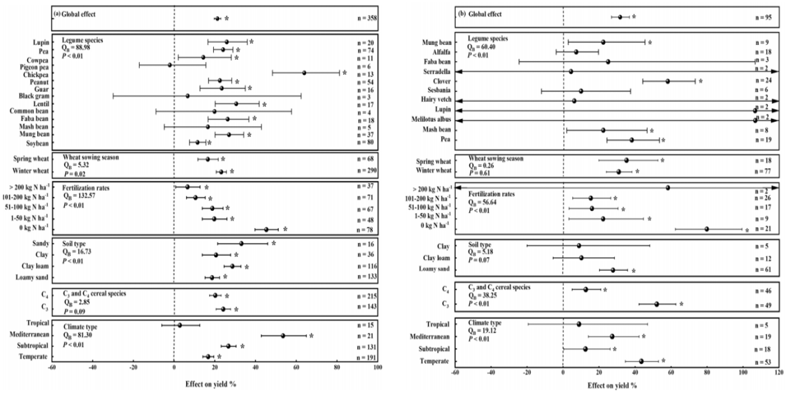豆类-谷物轮作是一种可有效减少氮肥投入、改善土壤质量并降低环境污染风险的可持续集约轮作模式。然而,与禾本科-谷物轮作相比,豆科-谷物轮作对后季谷物产量和氮素利用的影响尚缺乏定量评估,对于解释产量效应变化的因素以及豆科作物是否收获籽粒对后季谷物产量影响的差异仍未有全面解析。基于全球已发表的453项观测数据并融合连续4年的玉麦/豆麦轮作大田试验,对豆科作物-小麦和禾本科作物-小麦轮作对后季小麦产量和氮素利用进行了荟萃与田间效应分析。与禾本科作物-小麦轮作相比,豆科作物使后季小麦氮素利用率平均提高了8.57%。与玉米-小麦轮作相比,大豆-小麦和大豆接种根瘤菌-小麦轮作模式提高了0-40 cm土层土壤团聚体稳定性,降低了土壤容重,提高了土壤> 2 mm 粒径的团聚体相关氮素占比,改善了土壤有机氮组分的分布。大豆-小麦和大豆接种根瘤菌-小麦轮作模式显著增加了小麦季的土壤氮素净矿化量。