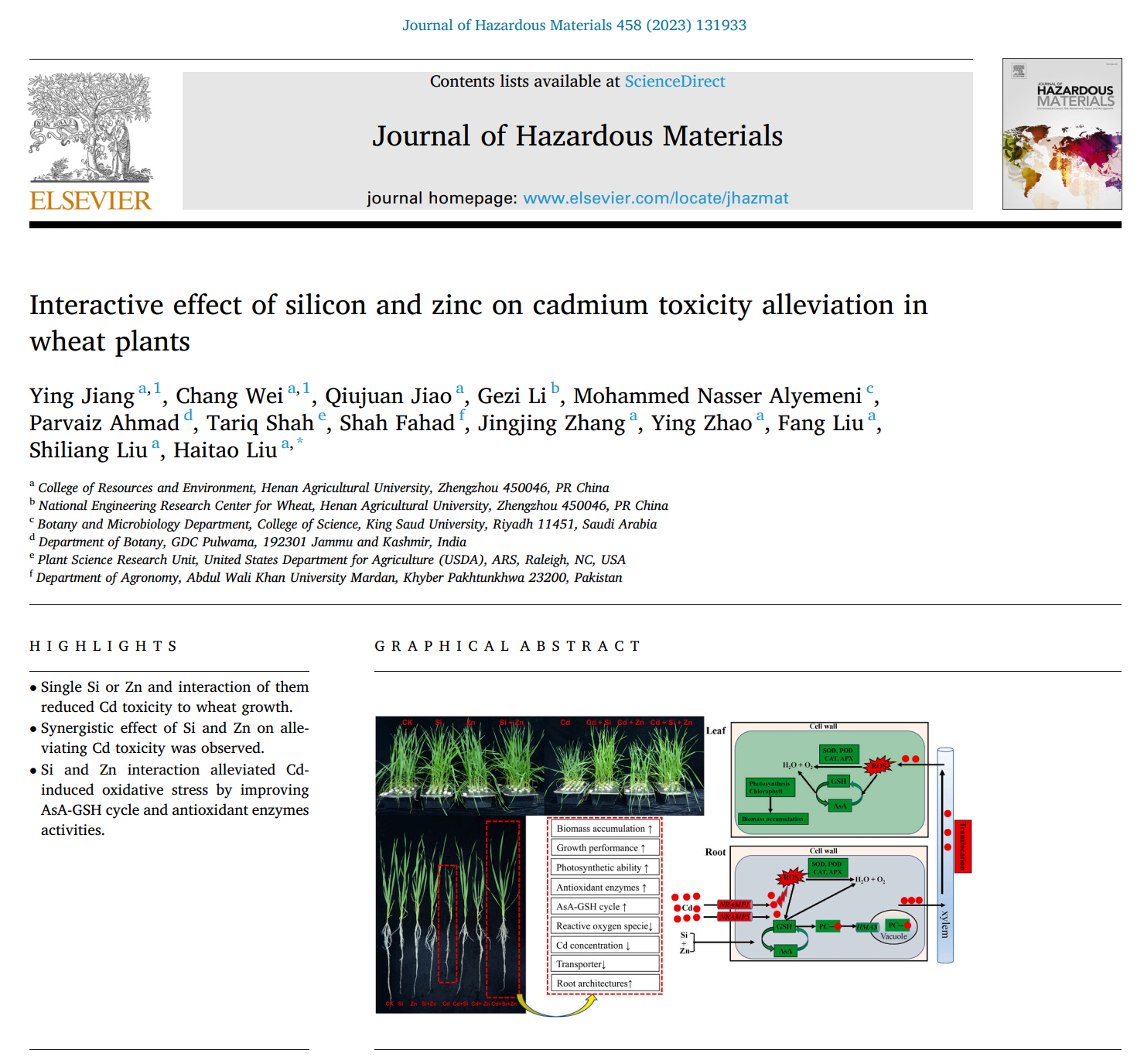 “土壤培肥与耕地保育”科技创新团队与“农田生产力绿色调控与功能性肥料” 科技创新团队在硅-锌元素互作缓解小麦镉毒害方面取得新进展。研究成果以“Interactive effect of silicon and zinc on cadmium toxicity alleviation in wheat plants”为题在线发表在环境科学与生态学TOP期刊《Journal of Hazardous Materials》(中科院一区,IF:13.6)。