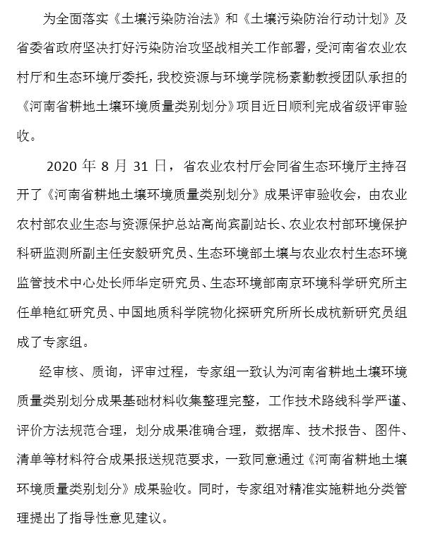 91国产 杨素勤教授团队承担的《河南省耕地土壤环境质量类别划分》项目通过省级成果评审验收