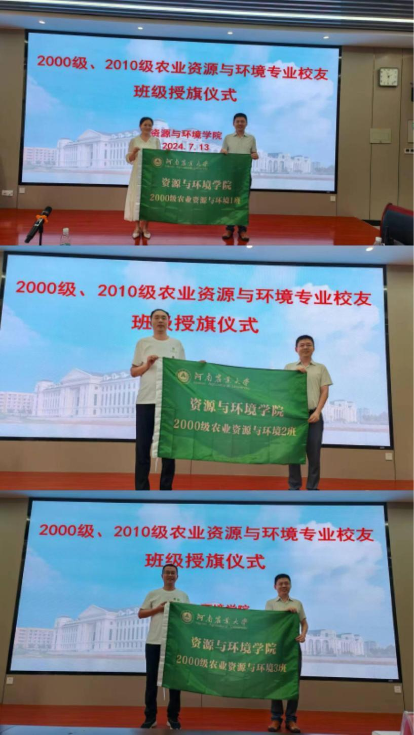 王宜伦代表学院致辞,他向各位校友介绍了学院的基本情况和近年来取得的成绩,并向同学们送上了美好祝福,希望校友们永远以母校为家,常回来看看,学院将搭建校友交流合作平台,共同为母校中国特色世界一流农业大学创建贡献力量。闫东代表学校向2000级农业资源与环境1-3班和2010级农业资源与环境1-4班授班级旗帜和校友徽章,希望校友不忘班级的荣誉、责任和使命,保持不断前进的动力,继续发扬专业的优良传统,在各自的工作岗位上,为社会贡献更多的力量。