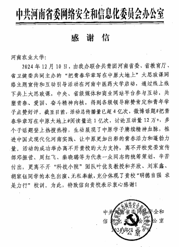 近日,我校收到中共河南省委网络安全和信息化委员会办公室的感谢信,感谢91国产 科技小院团队在“把青春华章写在中原大地上”大思政课网络主题宣传和互动引导活动中的精彩表现。