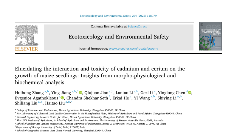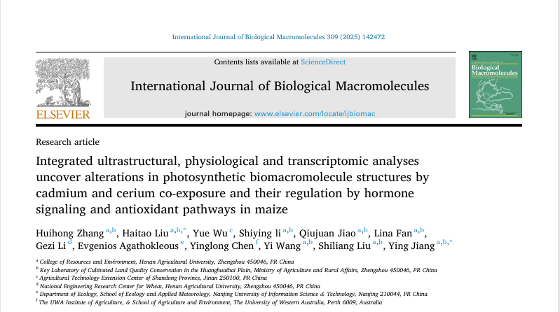 “农田生产力绿色调控与功能性肥料”科技创新团队与“土壤培肥与耕地保育”科技创新团队在玉米响应镉、铈暴露的生理生化及分子机制研究方面取得重要进展,相关研究成果分别发表于生物生化与分子生物学、环境科学与生态学领域知名期刊《International Journal of Biological Macromolecules》(JCR1区,中科院1区Top,IF=7.7)及《Ecotoxicology and Environmental Safety》(JCR1区,中科院2区,IF=6.2)。