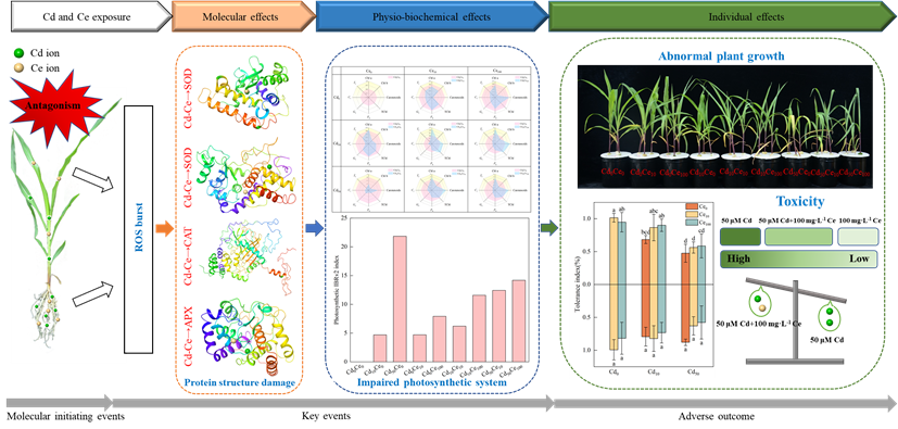 稀土元素具有全球性的重要战略和经济意义。然而,稀土元素的广泛开发和应用,导致了其在环境中的过量积累。此外,稀土元素污染通常伴随着土壤中的重金属污染,这已成为突出的环境问题。目前,关于稀土和重金属共暴露对作物的毒性效应及生态功能的机制研究较少。铈(Ce)和镉(Cd)分别为稀土和重金属代表元素,本研究以玉米为供试对象,通过设置不同浓度Ce和Cd,探究Ce和Cd暴露对玉米生长的交互作用及毒性机制。研究结果表明,Cd和Ce均以剂量依赖的方式通过增强氧化应激损伤抑制了玉米的生长。Cd和Ce的共暴露对玉米生长具有复杂的交互作用。Ce能够提高叶绿素含量,同时减轻镉诱导的叶片黄化现象。与单独添加50 μM Cd处理相比,分别添加10 mg·L−1和100 mg·L−1 Ce显著增加了叶绿素a含量52.2%和50.2%。生理生化效应水平指数结果表明,Cd和Ce的主要相互作用模式为拮抗作用,高浓度的Cd和Ce共暴露的生态风险比单Ce更高。研究为稀土元素和重金属共暴露的毒理学效应提供了重要的见解,也为未来有关联合污染的环境风险研究和管理策略提供了指导。研究结果以“Elucidating the interaction and toxicity of cadmium and cerium on the growth of maize seedlings: Insights from morpho-physiological and biochemical analysis”为题于2025年3月20日在线发表在《Ecotoxicology and Environmental Safety》上。