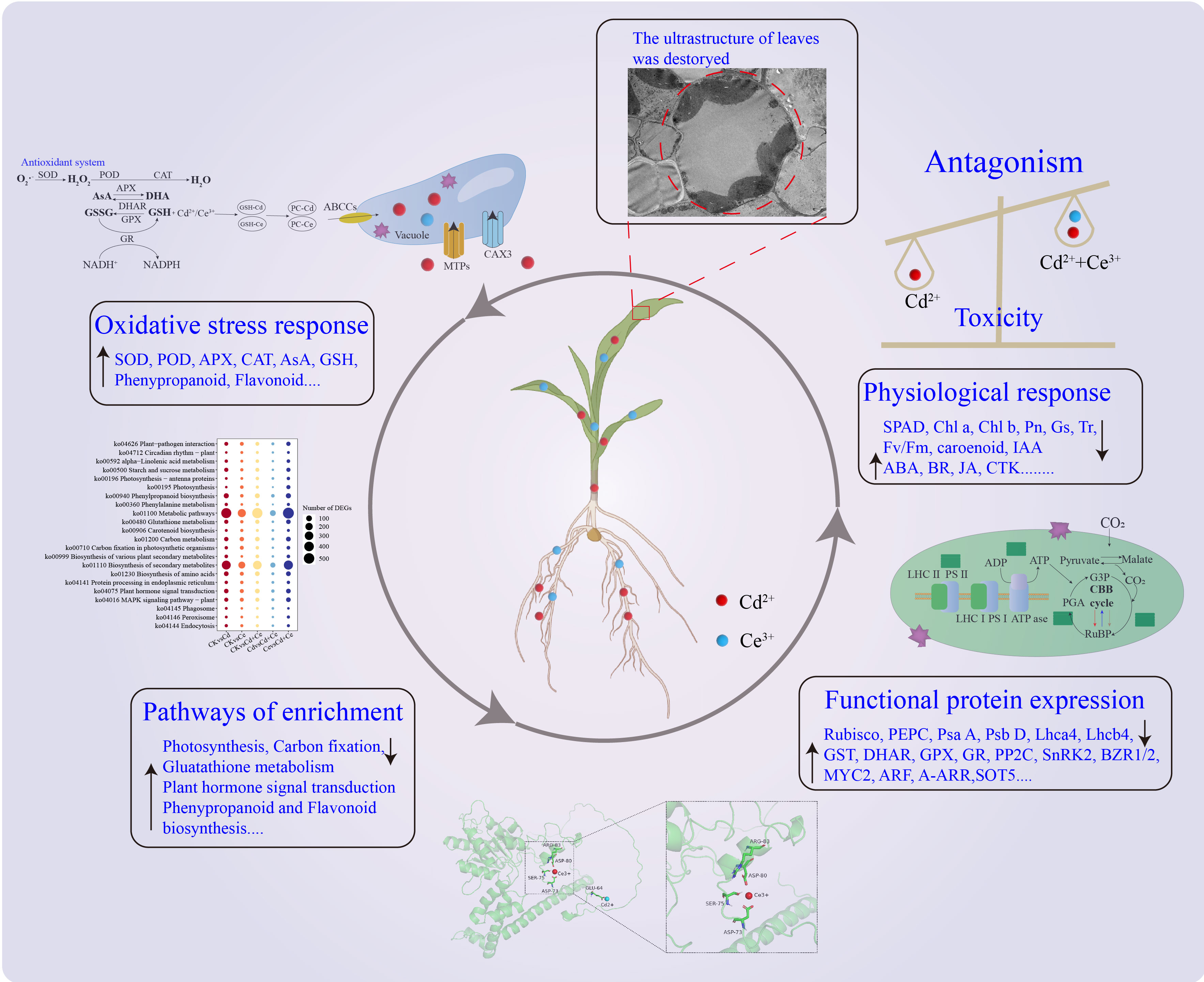 鉴于高浓度的Cd和Ce共暴露所带来的高生态风险以及对玉米叶片显著的损伤,综合超微结构、生理生化、转录组学和分子响应,探究Cd和Ce暴露影响玉米生长的潜在机制。研究结果表明,Cd和Ce暴露通过破坏光合作用和叶绿素合成,引起了ROS失衡,导致了对玉米生长的抑制。然而,与单独的Cd暴露相比,Cd和Ce共暴露对玉米光合系统的影响较小,因其减少了嗜锇质球蛋白的产生。转录组学和分子对接分析表明,Cd和Ce共暴露存在拮抗作用。Ce有助于修复Cd暴露的叶片中的光系统,促进叶绿素的合成和光合作用。然而,对碳同化蛋白结构的干扰和对激素信号传导、AsA-GSH循环和苯丙素代谢途径的破坏导致了氧化应激,主要表现在活性氧(ROS)水平升高及金属解毒途径受损。基因共表达网络分析挖掘出关键基因SOT5(Zm00001eb327110),发现该基因与光合作用、ROS清除和激素信号传导有关,是开发抗逆作物品种的潜在基因。这项研究为玉米如何应对重金属和稀土元素毒性提供了新的见解,并强调了提高抗逆性的关键途径。研究结果以“Integrated ultrastructural, physiological and transcriptomic analyses uncover alterations in photosynthetic biomacromolecule structures by cadmium and cerium co-exposure and their regulation by hormone signaling and antioxidant pathways in maize”为题于2025年3月29日在线发表在《International Journal of Biological Macromolecules》上。