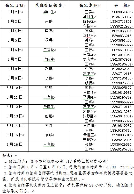 资环学院2017届毕业生离校期间值班安排表