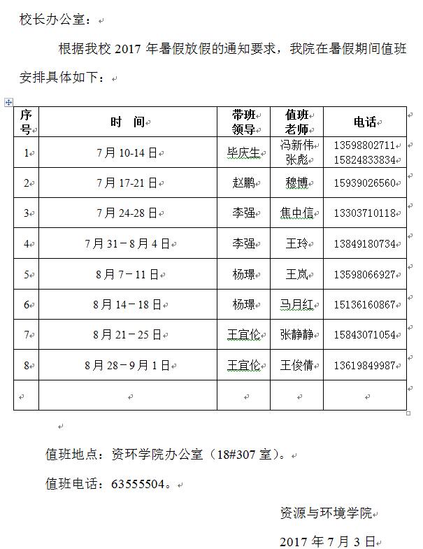 资环学院2017年暑假值班安排