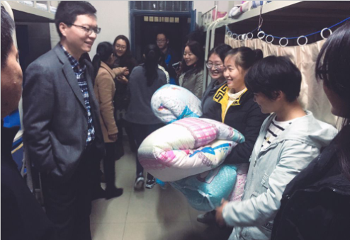 11月13日晚,资环学院党委书记毕庆生、党委副书记李强、副院长杨璟、副院长王宜伦、团委书记王玲、17级辅导员李畅老师走访了17级新生宿舍并给同学们送上了充满关怀的棉被。