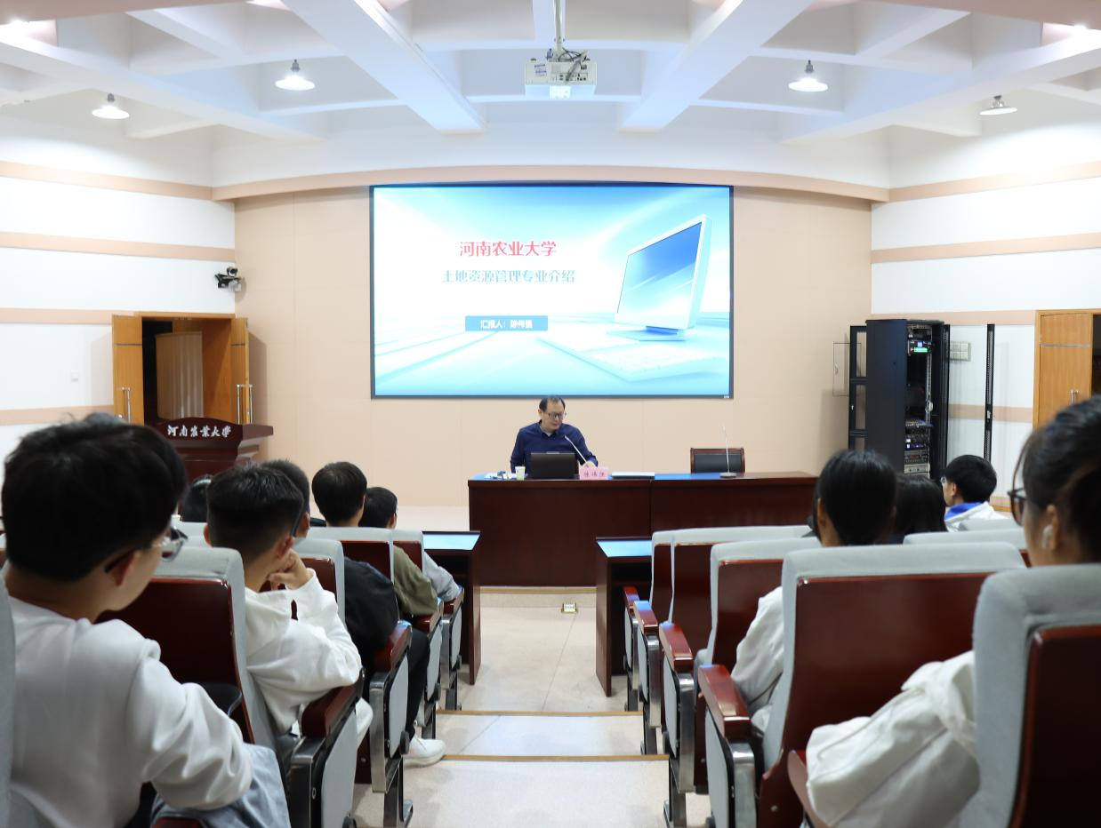 于10月12日晚在文化路校区300人报告厅举行土地资源管理系专业介绍会。土地资源管理系主任陈伟强,土管系教师冯新伟、李栋浩、吴用,23级土管专业、土治专业新生参会。