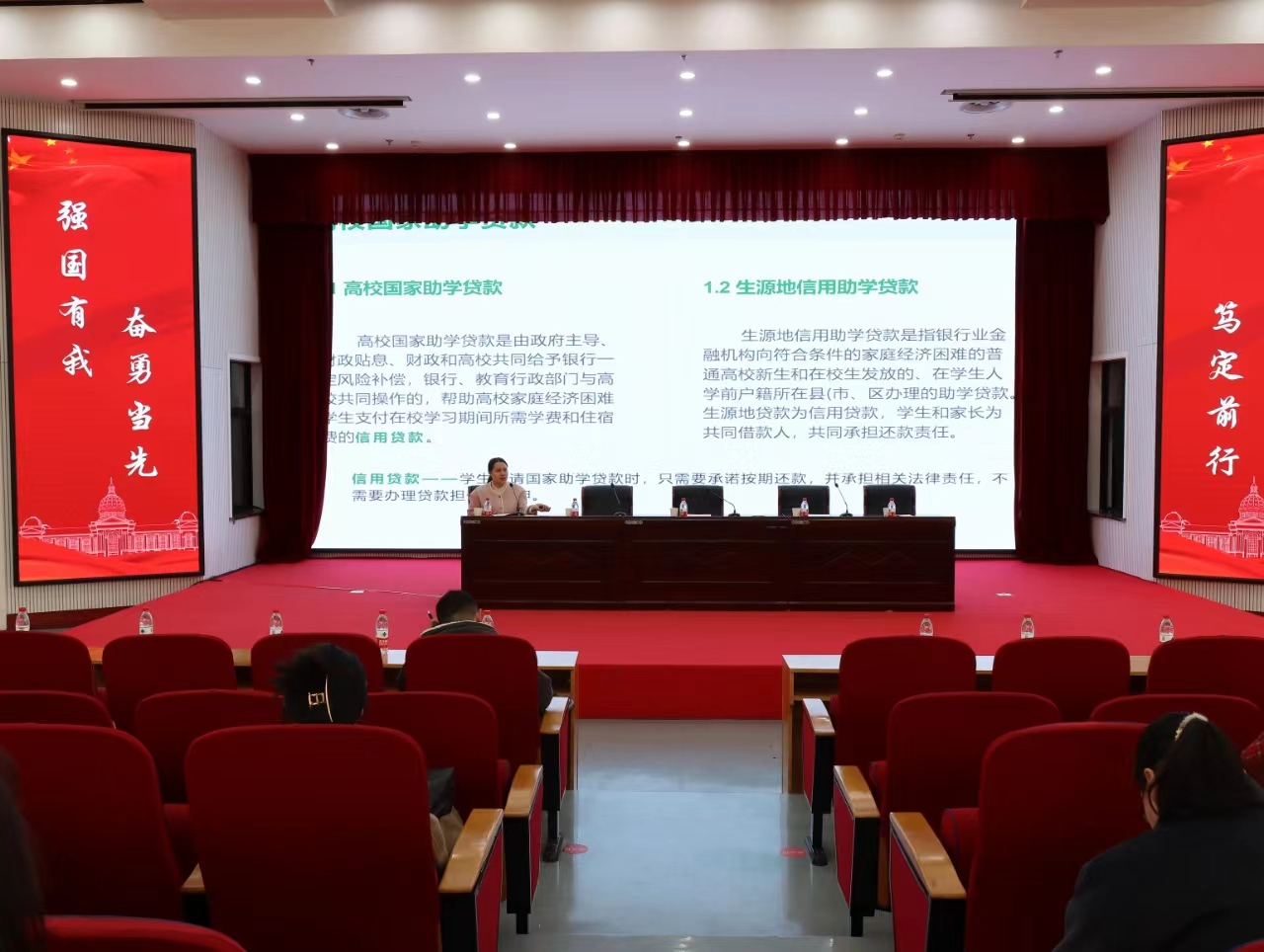 会上,黄春萌从国家助学贷款、助学贷款毕业确认、助学贷款偿还、助学贷款违约行为等四个方面进行政策讲解,并详细介绍了学生毕业之后如何及时偿还贷款,避免出现违约行为等。最后,她对应届生参军入伍和基层就业资助政策进行宣讲,帮助大家深入了解国家助学政策,提高诚信履约的责任意识。