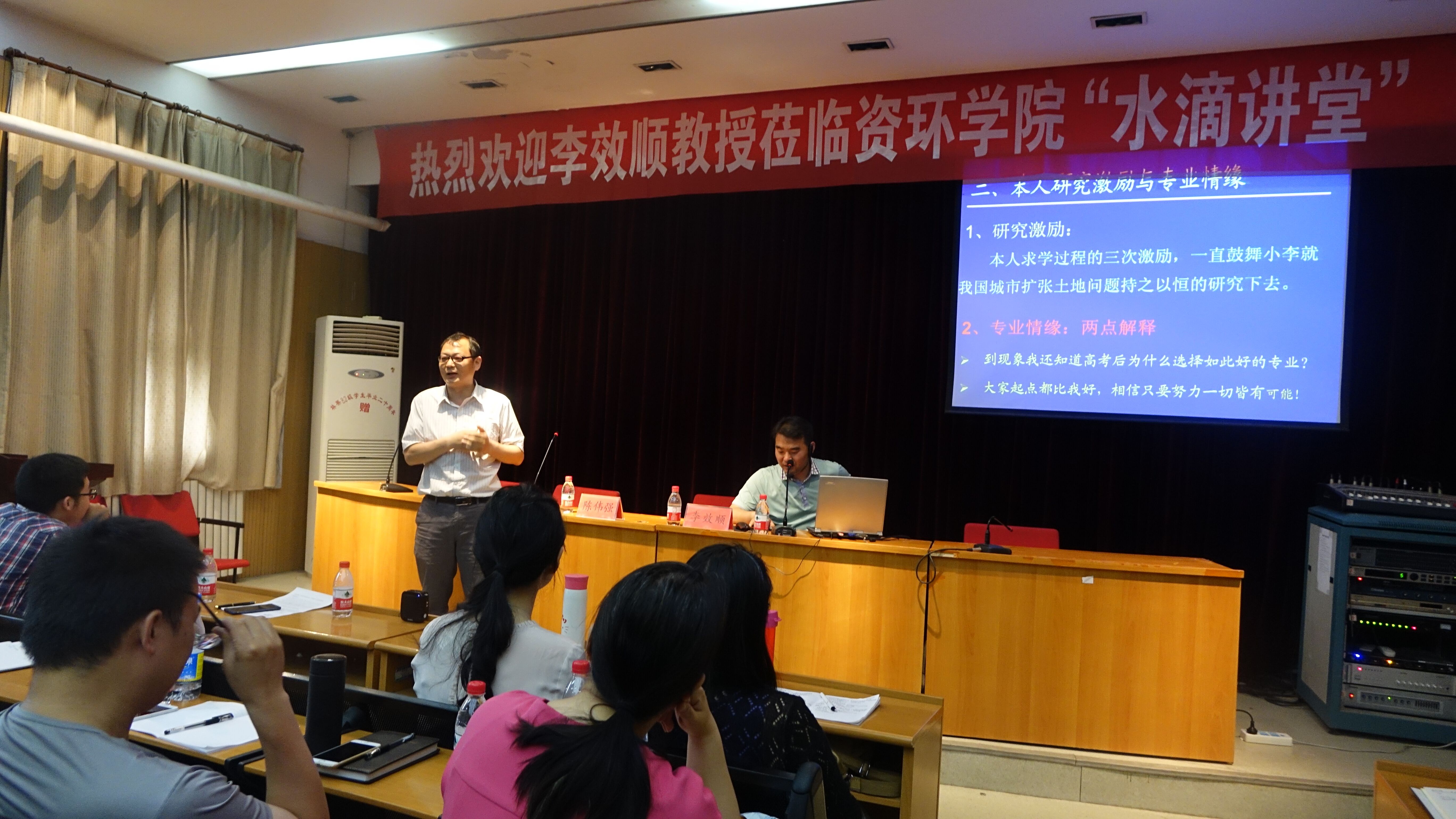 土地资源管理专业的杰出校友,现任江苏省资源环境信息工程重点实验室常务副主任,是中国高校十佳青年土地管理学家。报告会上,李教授主要介绍了中国土地非农化的影响、解析了城市蔓延特征效应、城市蔓延边界调控探索:实验与实践等方面,通过“和尚分粥”的故事生动的分析了我国耕地保护的现状及中国的发展与国外国家发展的不同。最后,李教授结合个人求学及学术研究经历讲述了自己与土管专业情缘,赢得在场师生的热烈掌声。