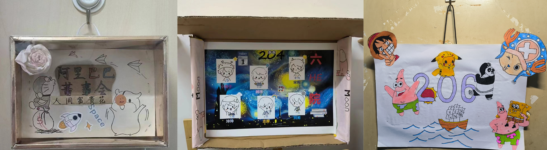 各新生宿舍充分利用身边的制作材料,本着“空间有限,创意无限”的理念,认真设计、精心制作自己的宿舍门牌。有的寝室将插花艺术融入寝室门牌,典雅大气;有的寝室将动漫人物粘贴在门牌上,俏皮可爱;有的寝室动手DIY,将色彩缤纷的小广告变废为宝,制作了独一无二的门牌……小空间体现大智慧,不同的设计使得宿舍风格各具特色,充满了生活气息。